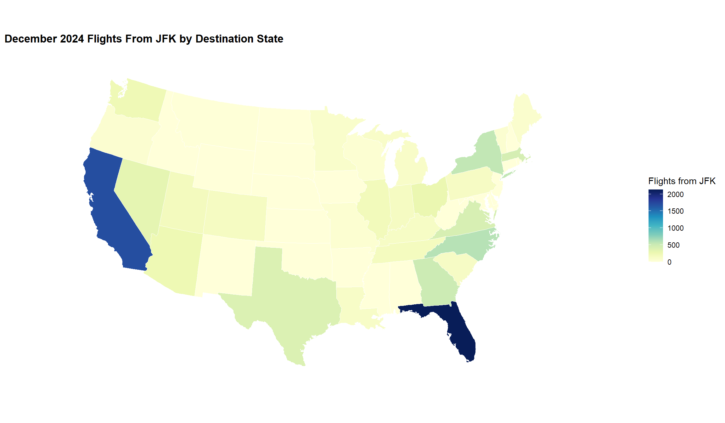 Rather than looking at specific airports at the very end of the year, this simple choropleth presents where flights from JFK departed to in December of 2024.